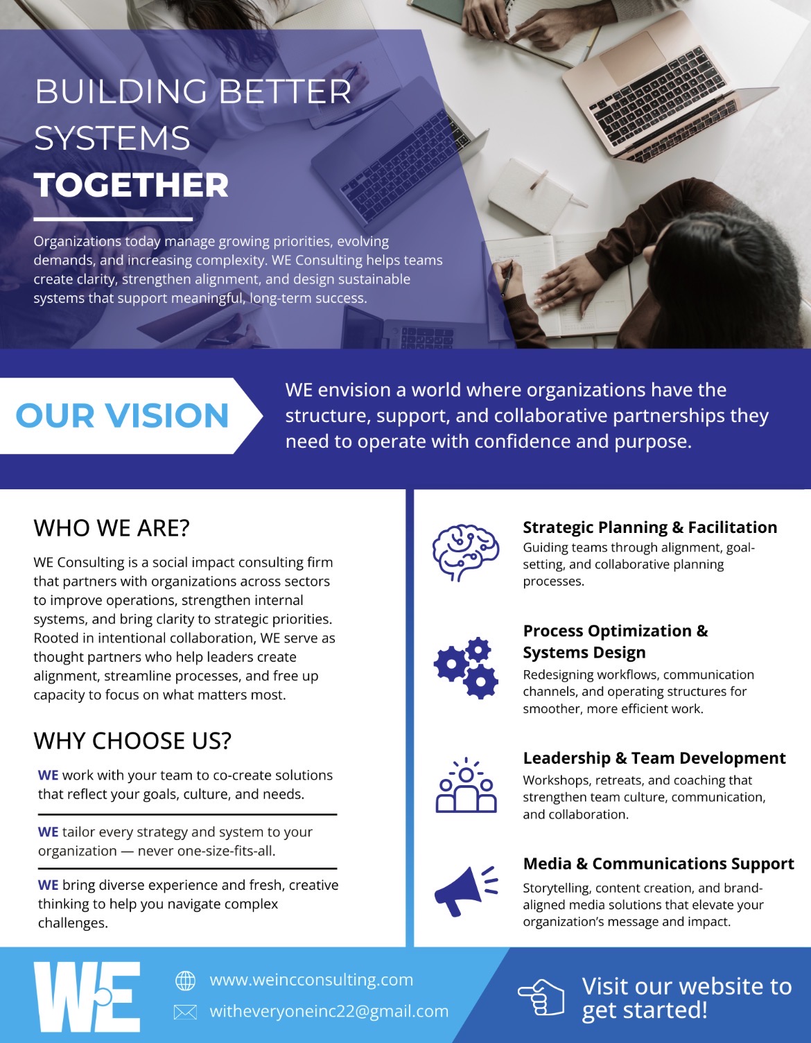 WE Consulting specializes in strengthening systems, improving internal operations, and helping leaders streamline their work. Our services include strategic planning and facilitation, process optimization through AI solutions, leadership and team development, and media and communications support, all designed to help organizations move from intention to execution.