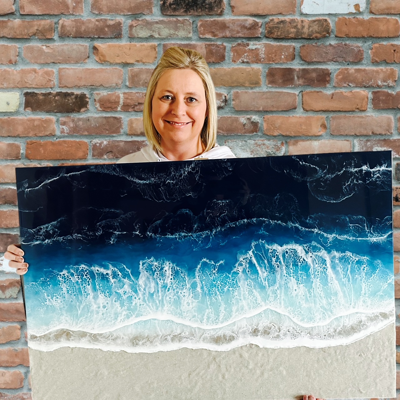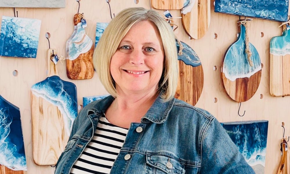 My main focus is on ocean resin art and fluid mixed media art. For the resin art, I mainly make charcuterie boards, trays, misc. home decor and earrings. I do have a laser machine and do some laser work on my boards for customized pieces. The laser machine came first along with the wood and resin earrings. I soon fell in love working with the resin and started to learn other techniques. I found a love for pouring on the charcuterie boards and loved the fact that they were a way for people to buy a piece of functional art. One of the most sought-after boards is the mitten. People love that board, and they can have a custom heart engraved for a special location. It is fair to say that people now call me the ocean wave girl. I also pour on trays, furniture, and misc. home goods.
