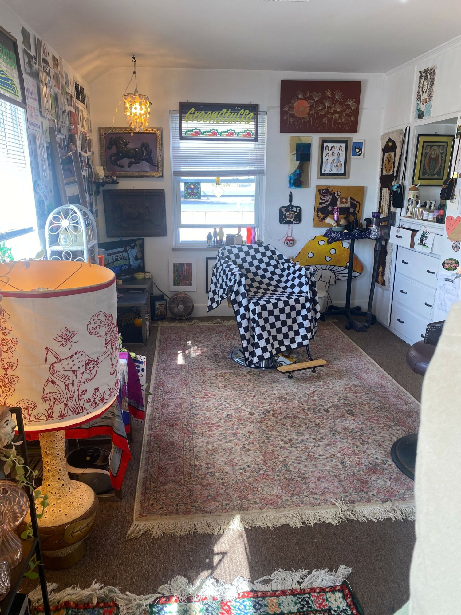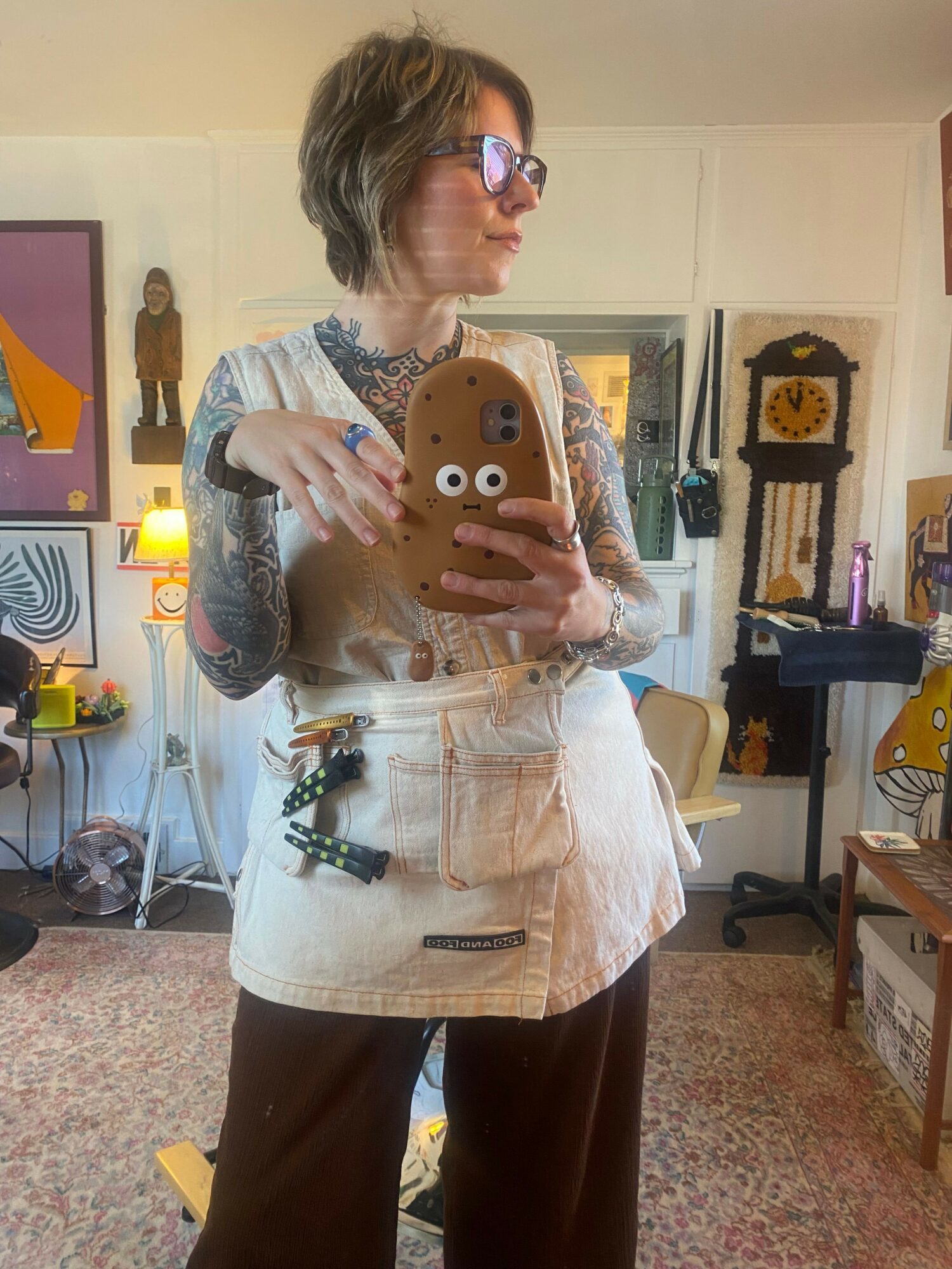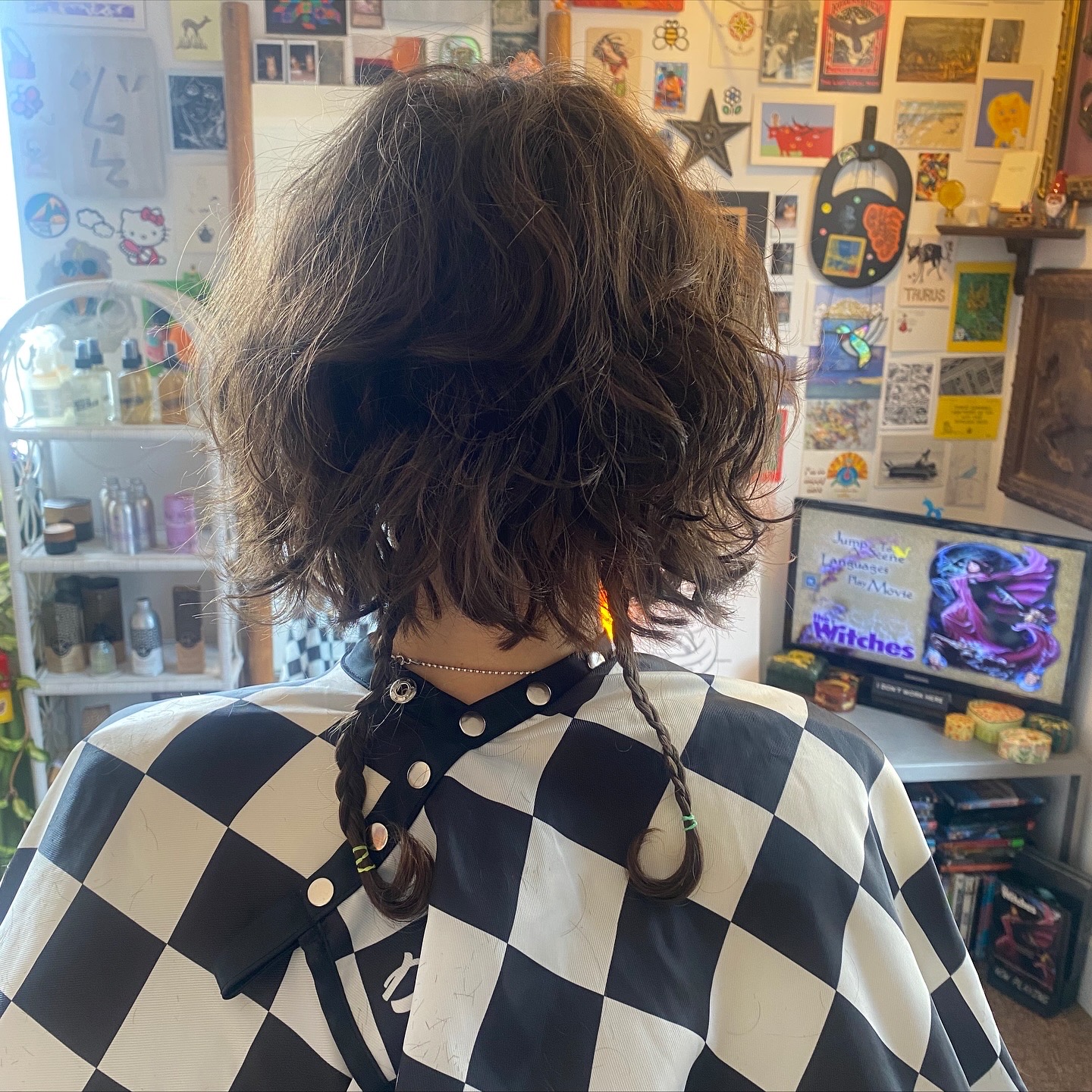 I went to hair school when I was 19- so about 20 years ago. I always loved doing hair, the idea of matching people with how they feel on the inside to what they see on the outside. I struggled finding a place to work that really fit with who I was and how I wanted to do hair. When I opened my own business about three years ago, everything changed. I’ve always wanted to create a safe space. Somewhere fun and filled with art- where everybody could be accepted, where we could collaborate together, where they could get what they wanted out of their hair, and where they could have an honest and fulfilling conversation with me. I wanted to create a place I could truly connect with people and take my time. I wouldn’t have gotten here if it hadn’t been for all of the things I had to do on the way, good and bad. Being a business owner and doing hair the way that I do has fundamentally changed me, for the better. I’ve always had cutting hair at the back of my mind, even when I pursued other endeavors. Fear of doing things the way that I wanted to, people not understanding my vision and not succeeding, all stopped me from doing things the way I do them now. To me, even doing this at all, and taking the risk, feels like a success. I believe in myself, I believe in my clients and friends, and I’m so grateful to work this job.