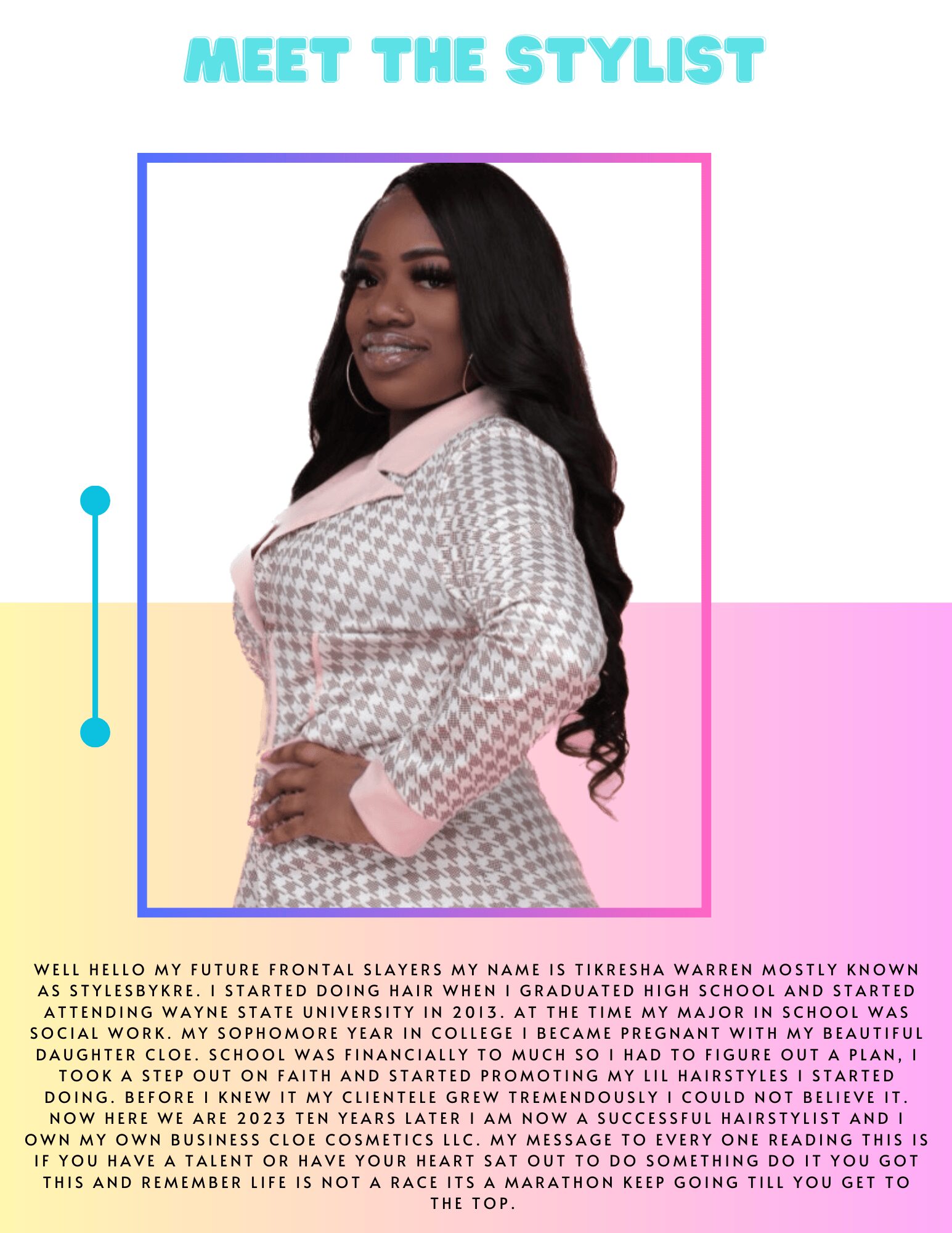 My name is Tikresha Warren I have a business which is Cloe Cosmetics LLC . We sell a variety of hair and cosmetics products for the day to day modern girls. What makes my brand unique is it is named after my beautiful daughter Cloe. Right now I am working on going from local to shipping all over the united states and also get me a website