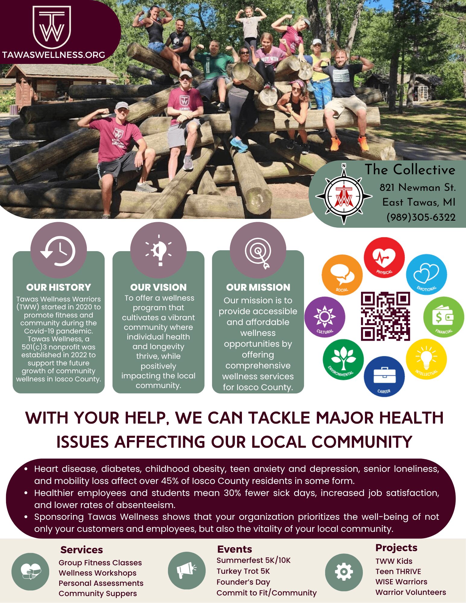 Tawas Wellness is more than a fitness organization—we are a nonprofit movement dedicated to making wellness accessible, affordable, and community-driven. We believe wellness isn’t a luxury; it’s a basic human need. Through our home base, The Collective in East Tawas, we provide programming that supports body, mind, and community connection.