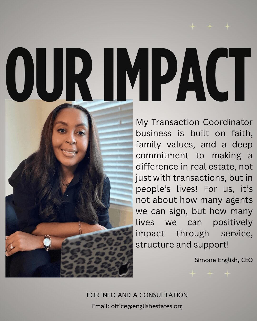 I’m Simone English wife, mom, veteran & CEO of English Estates. English Estates is a transaction coordinator business that supports real estate agents and brokers throughout the entire contract-to-close process. At the time I launched the business (2021), I was relocating from Michigan to Tennessee and I knew I wanted to stay connected to the real estate industry and serve others in a meaningful way. At first, it was just a side hustle as I was a stay at home mom, but I wanted to find a way to do what I love but still be present with my two children. I had strong background in administration and a foundation built in the military, so the structure, organization, and service to support others came naturally to me. I started marketing on social media, did email blasts, and then I finally partnered with my first 1-2 agents. My work, precision and professionalism spoke for itself and the referrals started rolling in! Now we service agents from all over the state, close hundreds of real estate transactions per year! My goal is to keep expanding and create a team of highly qualified transaction coordinators! Rooted in faith and family, English Estates is more than just a business, it’s a mission! We’re here to serve families, support agents, and make a difference in Michigan real estate through structure, service, and faith-based integrity.